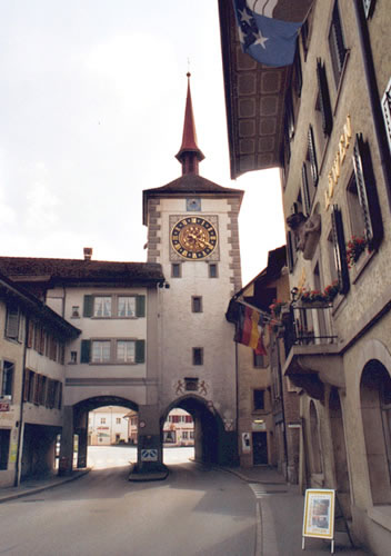 La porte de Lenzbuirg comporte deux cadran: un cadran simple vers l’extérieur, et un cadran tourné vers la ville avec quelques données astronomiques.