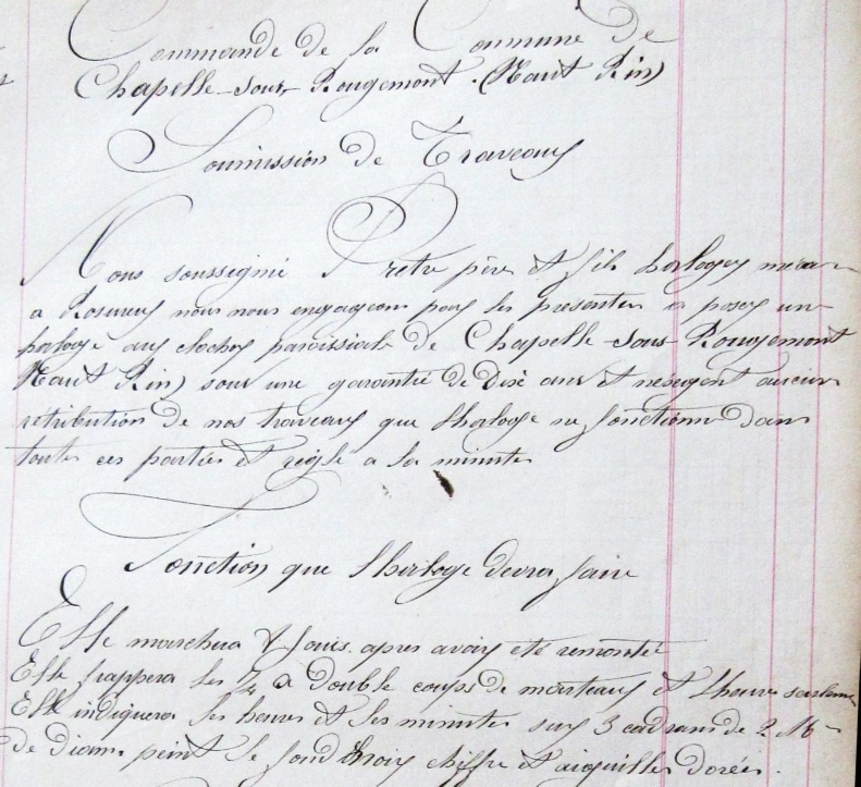 Les archives de La Chapelle sous Rougemont ayant disparu, nous savons toutefois que cette horloge (Prêtre père et fils) a été posée lors de la construction de l'église en 1860.
