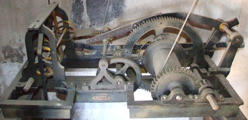 Actuellement désolidarisée de ce mécanisme, l’horloge fonctionne, électriquement.
