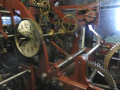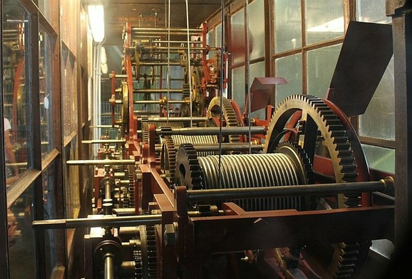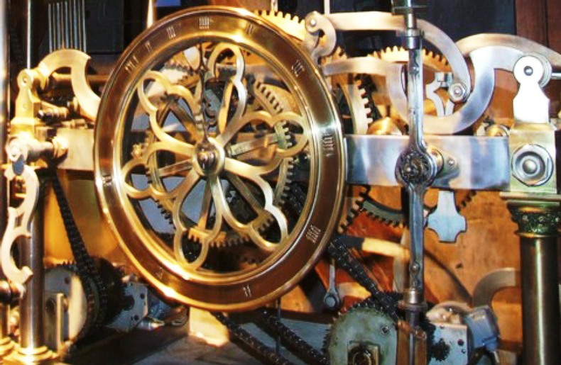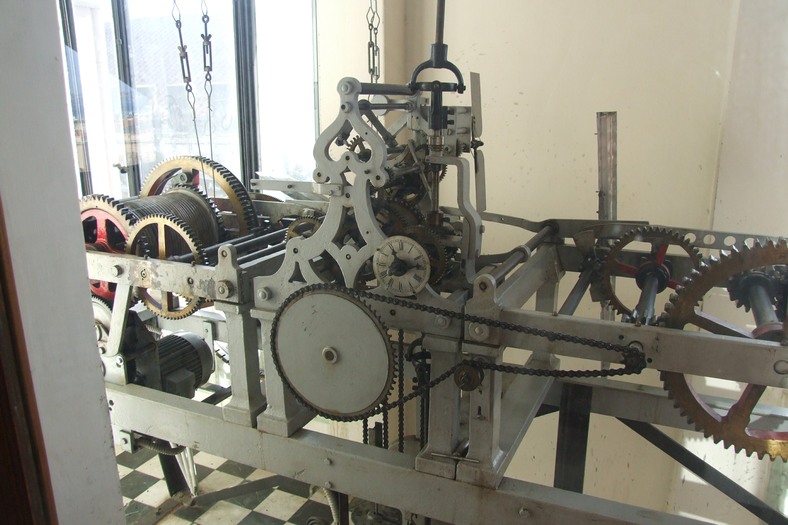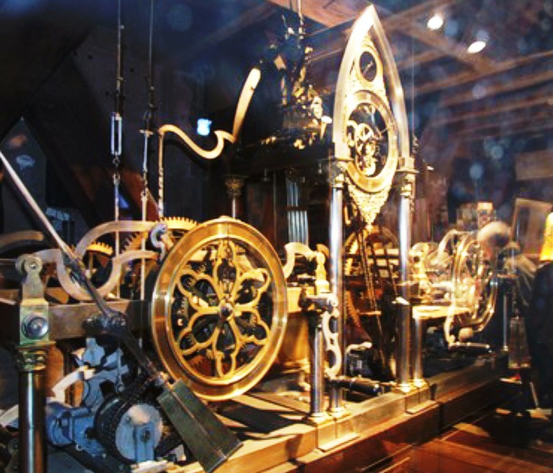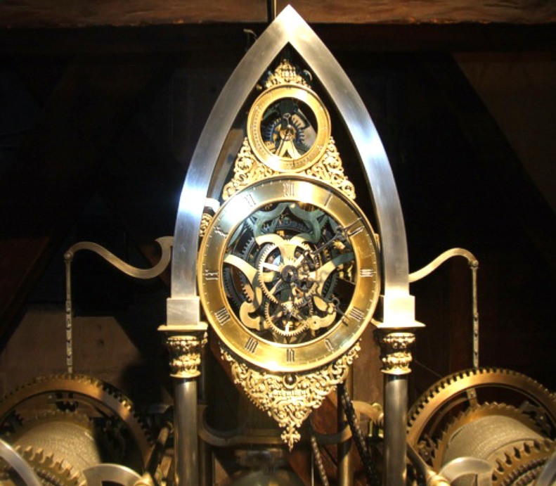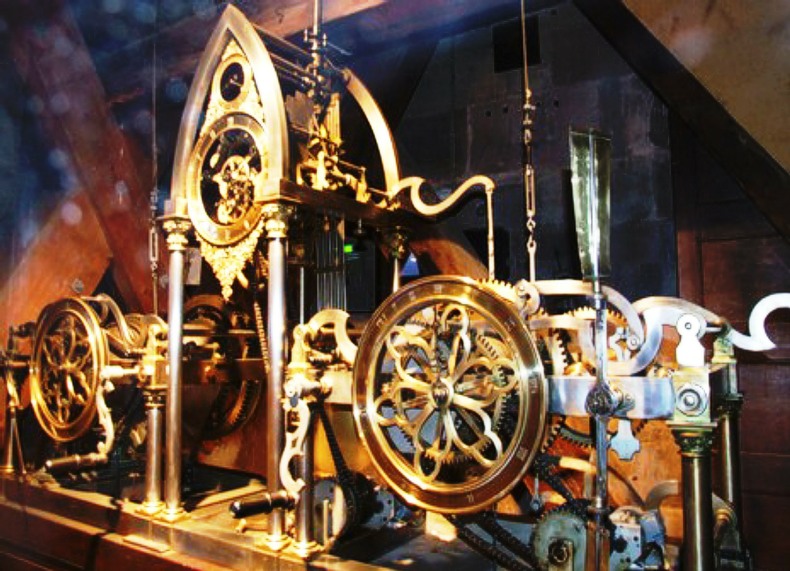 Les mécanismes reprennent en partie ceux de l’horloge astronomique de Strasbourg, et occupent deux façades sur une hauteur de quarante cinq mètres.