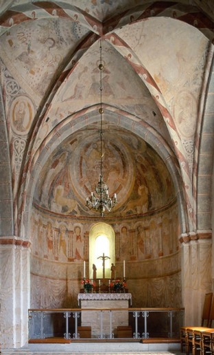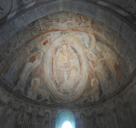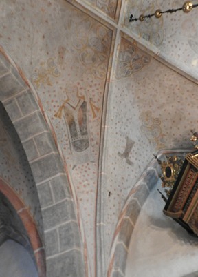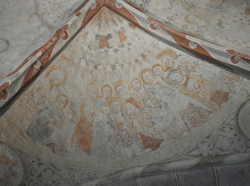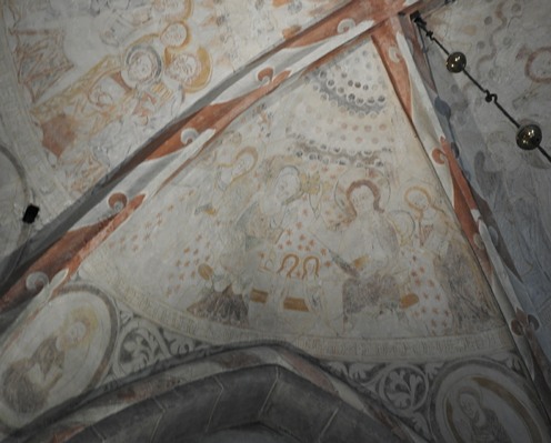 Sur le plafond, des fresques de différents siècles, à partir des années 1100 ! plus tard ont été ajoutées les peintures gothiques dans les manteaux de voûte.
