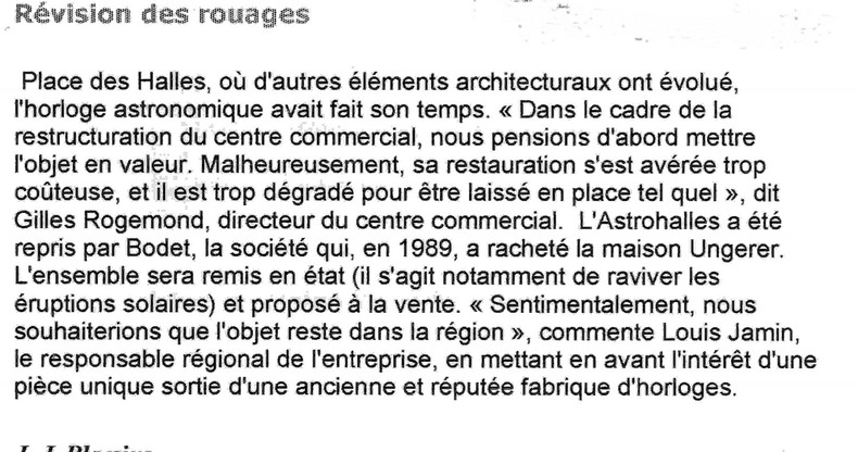 L'entreprise Ungerer installe un système astronomique Soleil-Terre-Lune sous la verrière du principal hall du centre, démonté en 1998.
