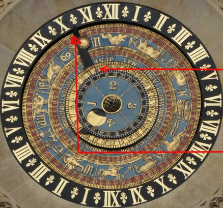 La lune traverse le méridien et donne l’heure de la marée haute à London Bridge (fleche rouge)