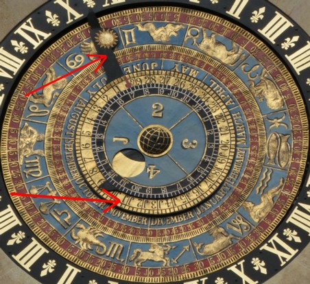 Le disque du soleil placé représente son cycle autour de la terre avec sa place dans le zodiaque, et les 360° de l’écliptique.