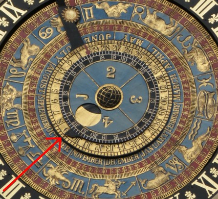 Toujours sur le deuxième plateau, une flèche rouge qui est pointée sur le petit disque et indique sur les divisions du premier plateau, l’heure de la culmination de la lune, ou son passage au méridien.
