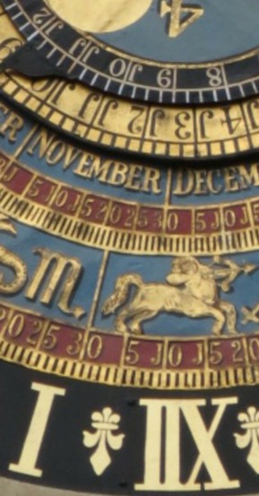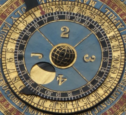 Un des chiffres 12 correspond à l’axe de la découpe ronde, un ergot à cet endroit, indique l’âge de la lune du mois synodique sur le deuxième cadran, soit le nombre de jours écoulés depuis la nouvelle lune.