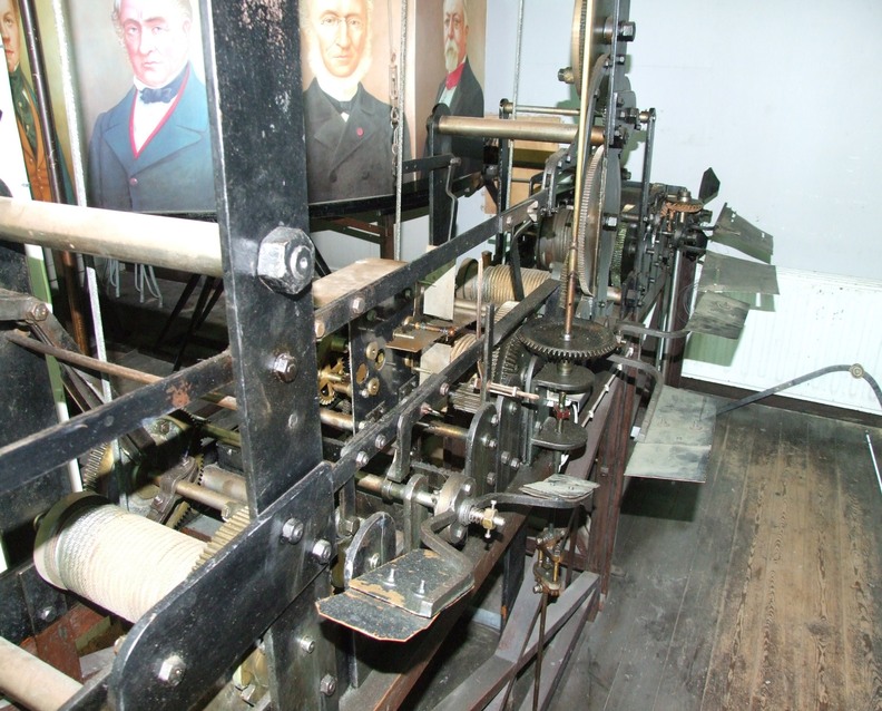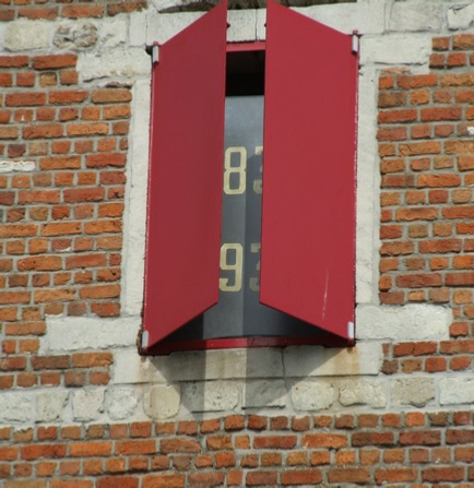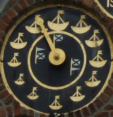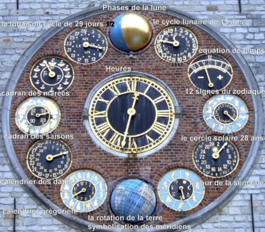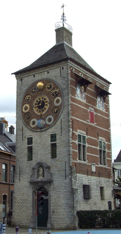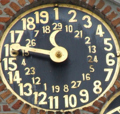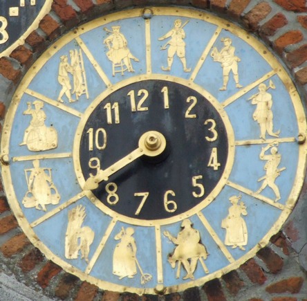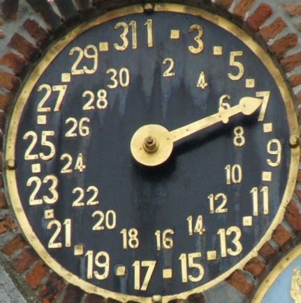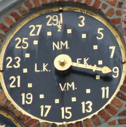 Marées de la Nèthe : cette rivière côtière arrose Lier. Un cycle dure 12 h et 25 minutes. Le cadran montre que la marée haute intervient plus brutalement que la marée basse.