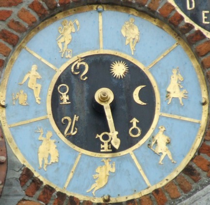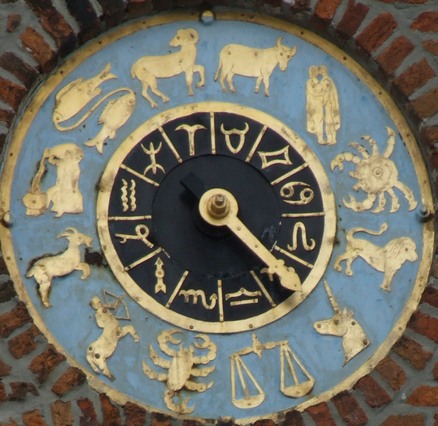 Le zodiaque avec ses 12 signes allégoriques. Montre dans quelle constellation se trouve le soleil.