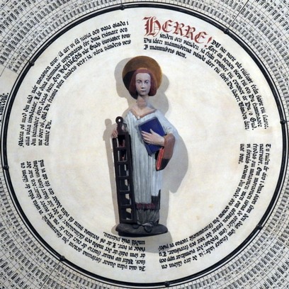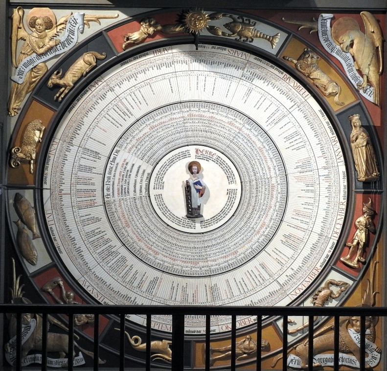 Au milieu du calendrier se trouve la statuette en bois de saint Laurent, saint patron de la cathédrale.