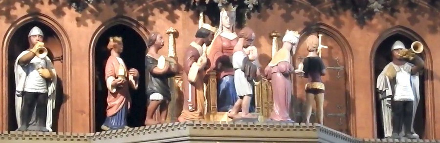 L'orgue de l'horloge, le plus petit de l'église, joue alors In dulci jubilo, alors que six figures en bois, représentant les rois mages et leurs servants, passent et s'inclinent devant Marie et Jésus-Christ,
