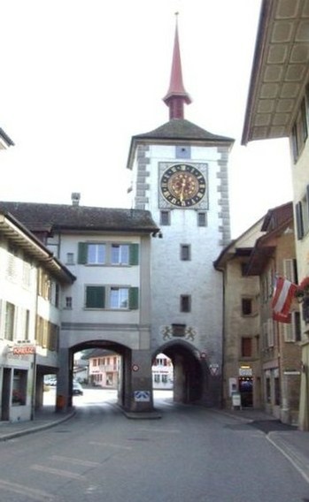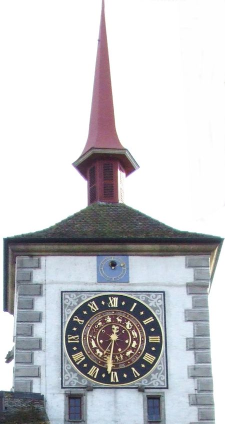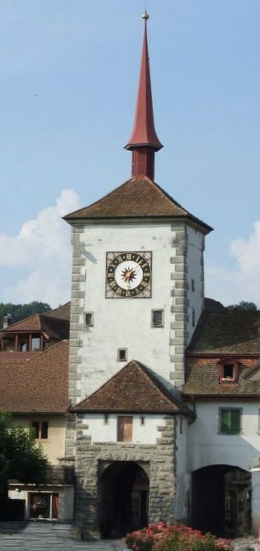 La porte de Lenzburg, un cadran simple vers l’extérieur et un cadran tourné vers la ville avec quelques données astronomiques.