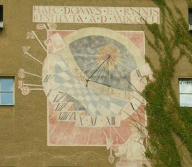 Munich : façade du Deutches Museum, cadran déclinant du matin, peint, double chiffrage des heures, style bouleté avec bipied - daté MDCCCCLI (1951), réalisé par H. Kaspar ,Devise : "HAEC DOMVS EX RVINIS RESTITVA AD MDCCCCLI"