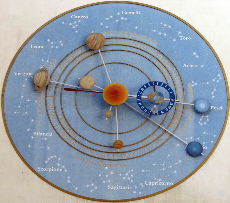 Ce cadran représente le système solaire dans la version de Copernic et de Galilée, à la différence des horloges anciennes qui ont placé la Terre au centre de l'univers.