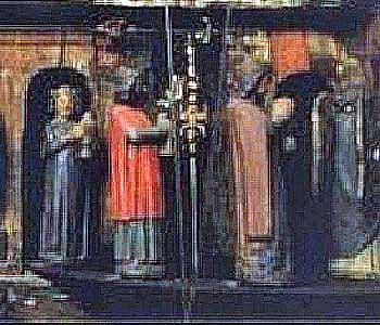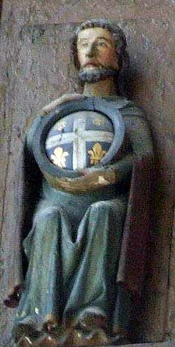 (croix d'argent cantonnée de quatre fleurs de lys sur fond d'azur)