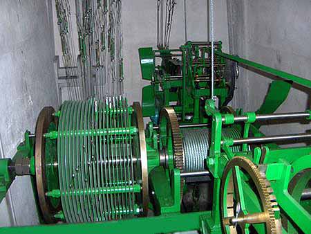 Les poids, situés en haut de l'horloge, sont remontés électriquement toutes les 12 heures.