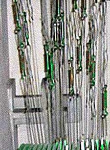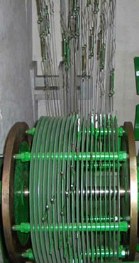 La roue métallique située à gauche tourne lentement et chacun de ses ergots (ou cran de cuivre) agit sur l'un des câbles inox placé au fond pour actionner mécaniquement le marteau de la cloche à laquelle il est relié.