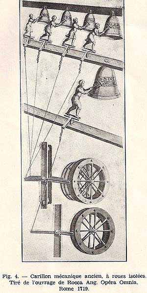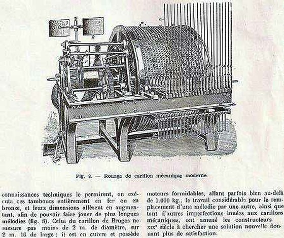 Les disques parallèles parsemés de taquets dits « etoquiaux » et qui, avec la rotation du tambour, culbutent les leviers qui tirent les fils de fer reliés à des régleurs de tensions, et font tinter les marteaux installés sur les cloches en jouant ainsi un air prédéfini.