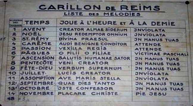 Nous n'avons malheureusement pas de vidéo du carillon de de l'horloge astronomique de la Cathédrale de Reims, mais pour vous faire une idée, nous vous invitons à visionner celle du carillon de la Chambre de Commerce et d'Industrie de Belfort. En effet, ils sont tous deux de même facture: cliquez ici