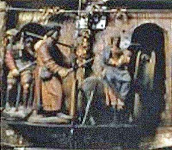 Marie et Joseph fuyant en Égypte, précédés par un ange et poursuivis par deux sbires d'Hérode.