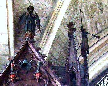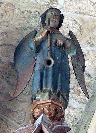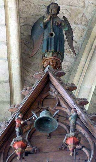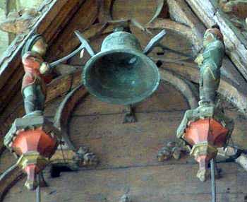 Dans l'ogive, une cloche frappée chaque heure par deux jacquemarts, alors que l'ange du sommet agite la tête.