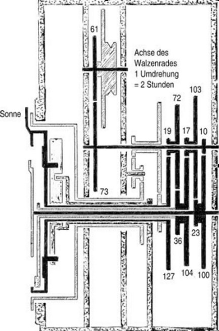 Le mécanisme d’apparence sophistiqué mais relativement simple se base sur les rapports à appliquer aux différents pignons pour prendre en compte, non seulement la variation de durée de la journée solaire, mais également la variation de la durée de la journée astrale.