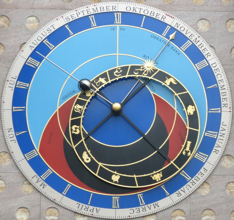 La partie astronomique de l'horloge se compose d'un astrolabe qui affiche :