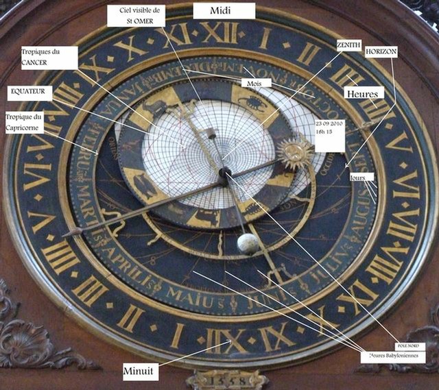Construite en quatre ans, de 1555 à 1559, par Pierre Enguerrand, la date et le signe de l’auteur y sont gravés. L’horloge astronomique de la cathédrale de Saint-Omer est une horloge calendrier, une horloge astrolabe (position des astres et constellations) et une horloge astrologique (signes du zodiaque).