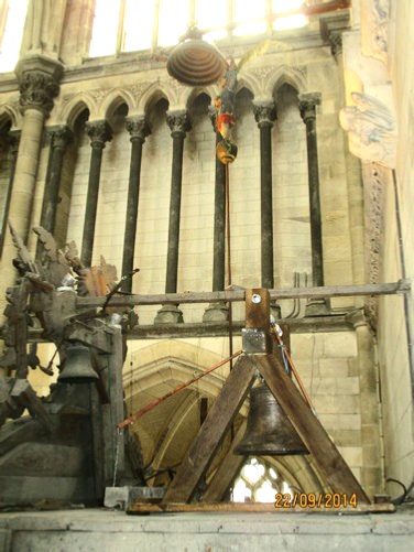 Photos jointes ci-dssus et ci-dessous : de la cloche et du marteau des 1/4, de la cloche des 1/2 et une vue du jacquemart sans son marteau ainsi qu’une vue générale par le dessus de toutes les sonneries .