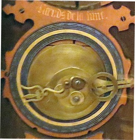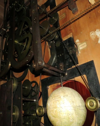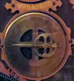 Les roues dentées sont reliées par une chaîne et leurs axes font tourner - à l’endroit ou a l’envers - des aiguilles sur les cadrans.
