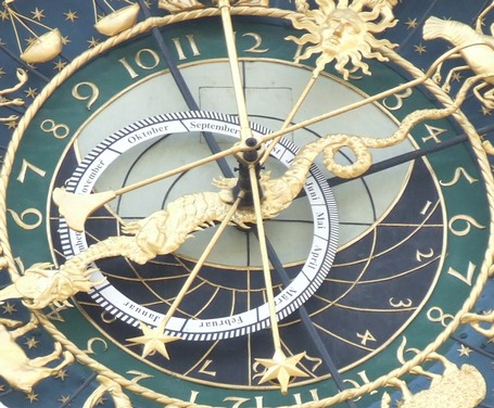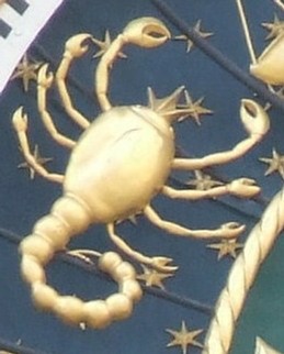 Sur un fond bleu azuré piqué d’étoiles dorées, sont représentés les douze signes du zodiaque. Ce cercle, marqué des 360°, décrit un tour en un jour sidéral de 23h56mn.