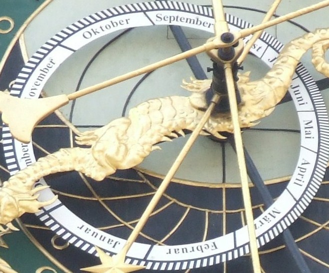 Le fond du cadran, de couleur bleu foncé, est muni de courbes divisant le jour de clarté en douze parties égales et de la ligne de l’équateur et des tropiques. La partie en blanc représente l’horizon de Ulm.