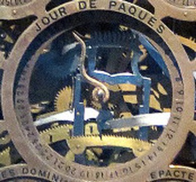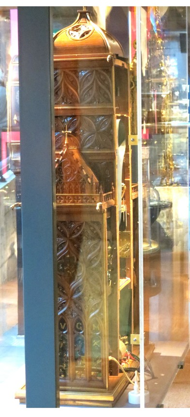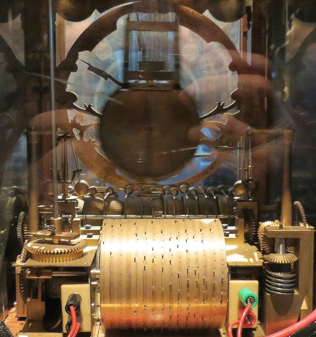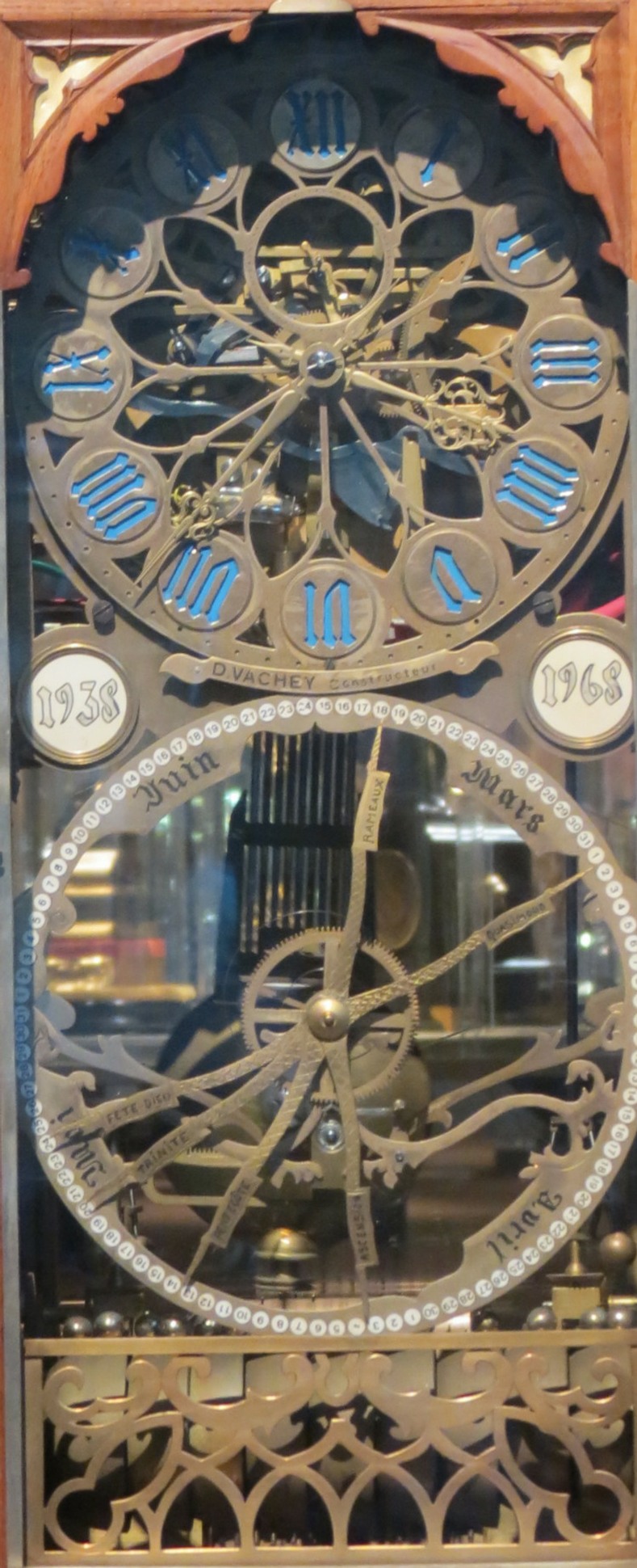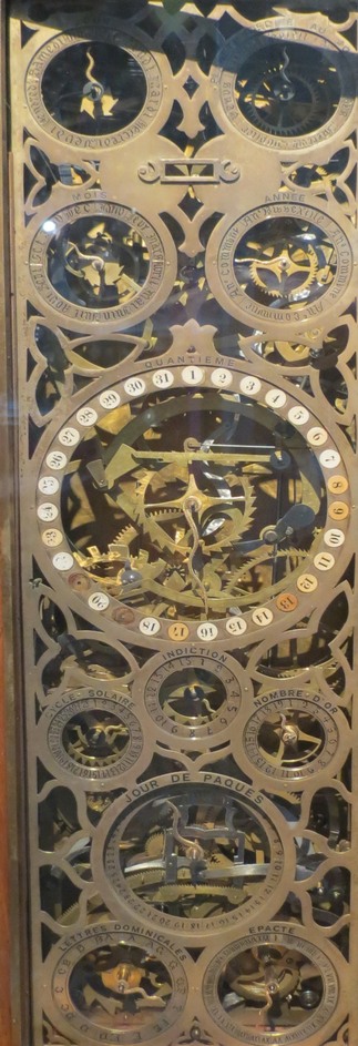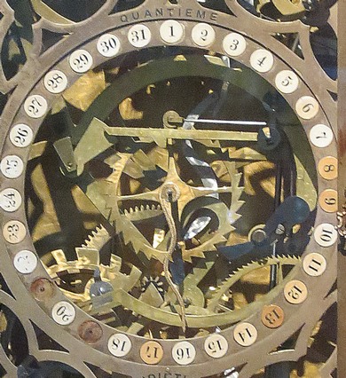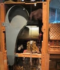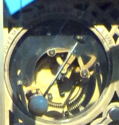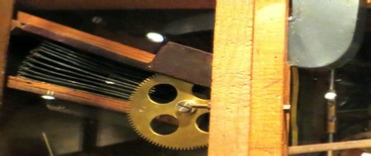 On aperçoit l’arrière du balancier. Au premier plan, le tambour du carillon
