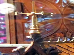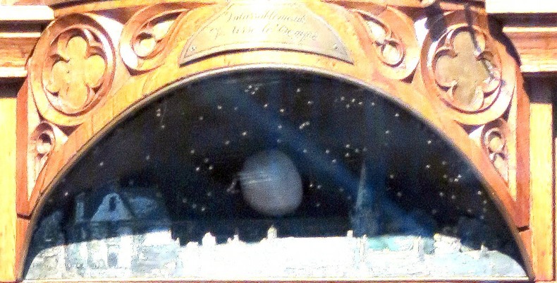 Manque de luminosité, apport de lumière interdit, reflets de l’armoire vitrée qui abrite le cabinet de l’horloge.