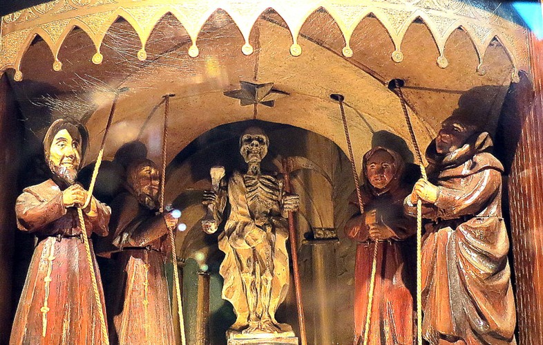 La grande faucheuse : la mort. Les moines sonnent les quarts et les heures.