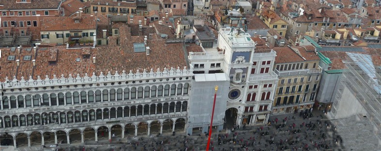La place Saint Marc de Venise, vue sur la tour de l’horloge du haut du campanile.
