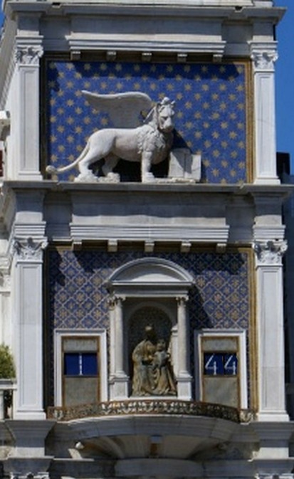 Au-dessous des jacquemarts, le lion ailé de Saint Marc avec les tables de la loi figure en avant sur un fond d’étoiles.