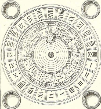 Le cadran 24 heures en chiffres romain, établi sur le système géocentrique donne la position du Soleil dans le zodiaque, les phases de la lune par rotation sur elle même et le terre au centre (Géocentrisme)