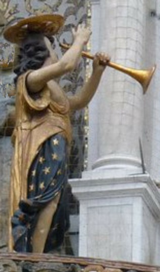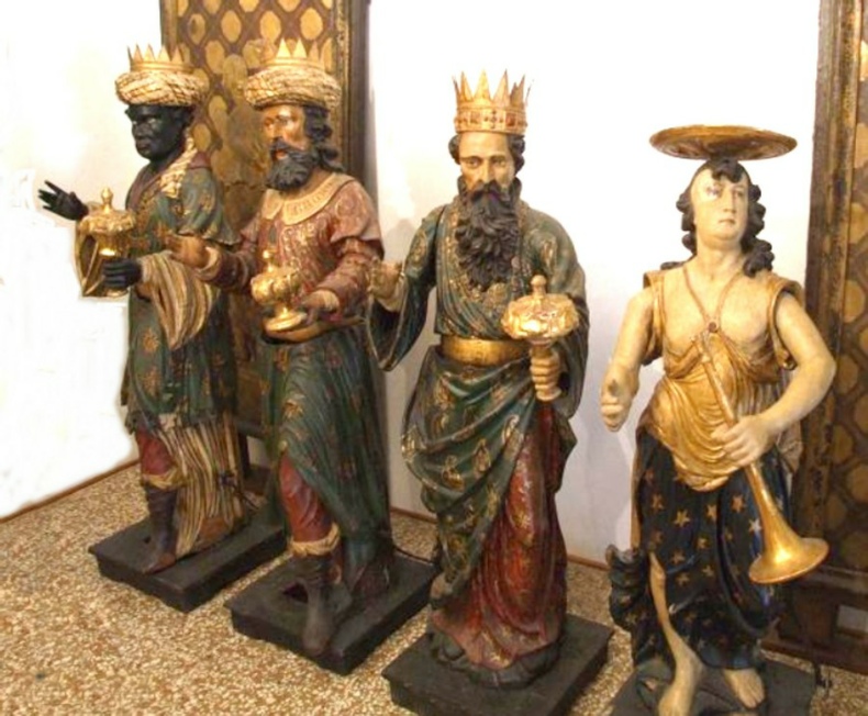 Les trois Rois Mages, en bois, richement habillés, précédés d'un Ange avec la trompette, défilent devant la statue de la vierge, s'inclinent en signe de révérence et rentrent par l'autre porte.