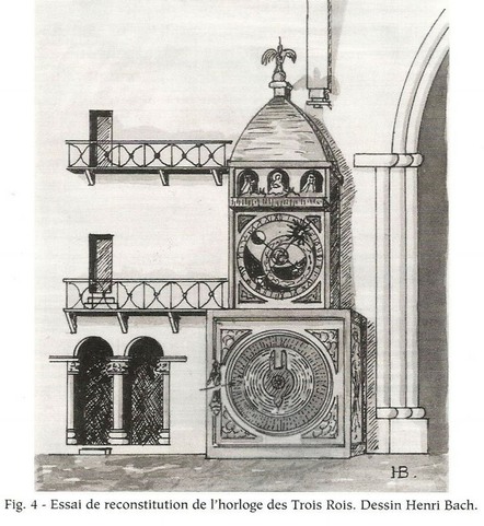 Ce dessin est extrait du merveilleux ouvrage : Les trois horloges astronomiques de la cathédrale de Strasbourg par Henri BACH et Jean-Pierre RIEB, avec la collaboration de Robert WILHELM.