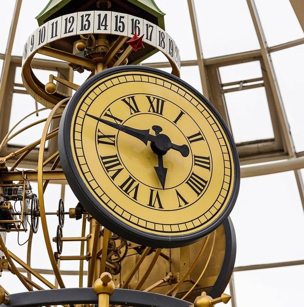 Une élégante horloge-calendrier qui donne heures et minutes sur ses trois cadrans.
