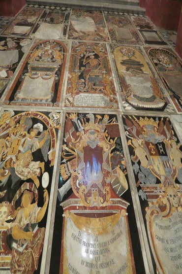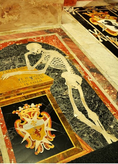 Au total, 400 tombes de chevaliers en marbre rouge, blanc, noir et sur lesquelles sont dessinés des squelettes et les armoiries de chacun.