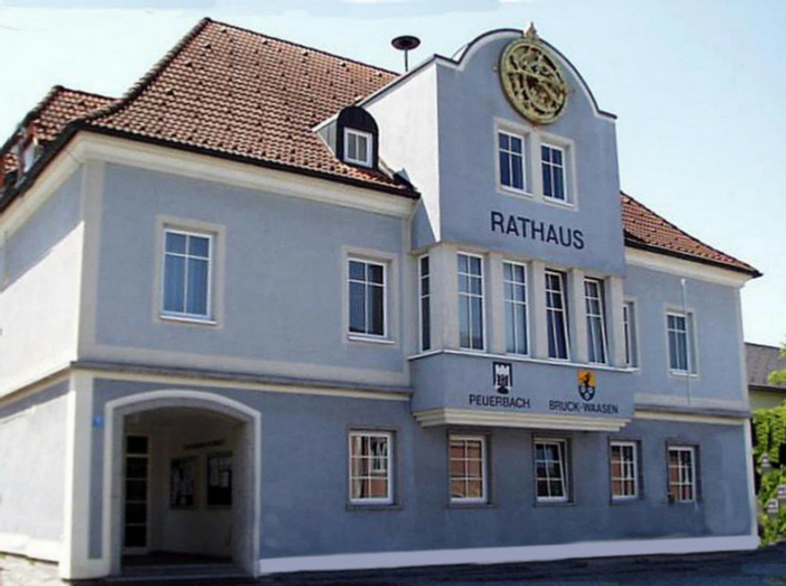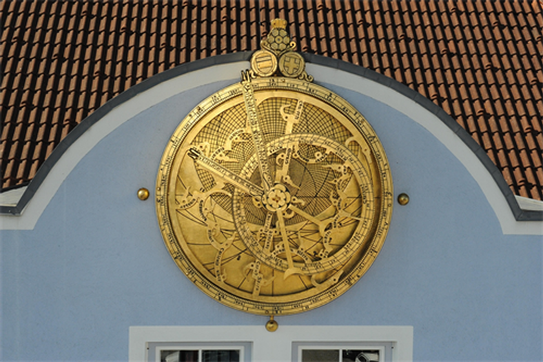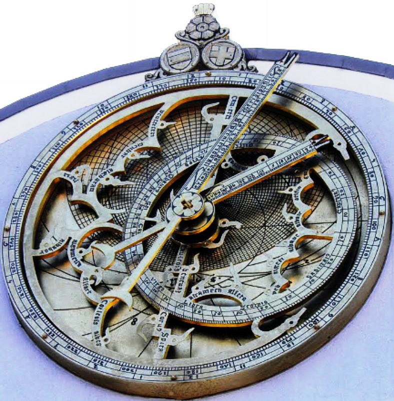 Ici, la représentation sur la façade, 2,10 m~, grossie 15x de l'astrolabe (1993-1994) du célèbre astronome et mathématicien Georg Aunpekh de Peuerbach (1423).