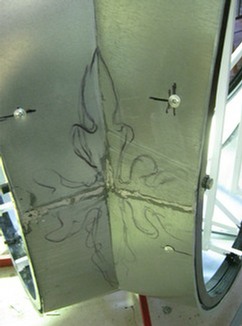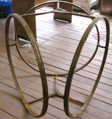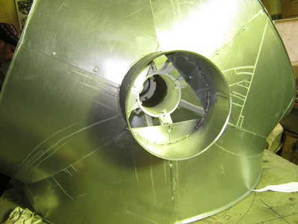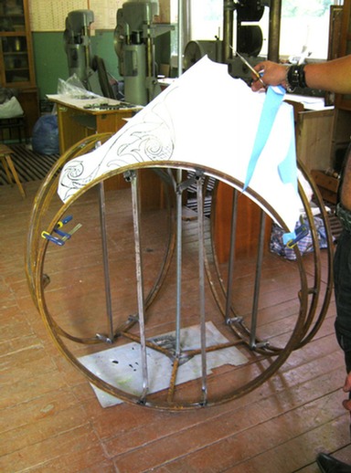 La tôle de l’ensemble de cette œuvre, après traçage, est entièrement découpée avec une paire de cisaille, puis repoussée, martelée.