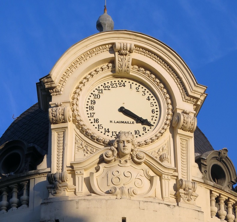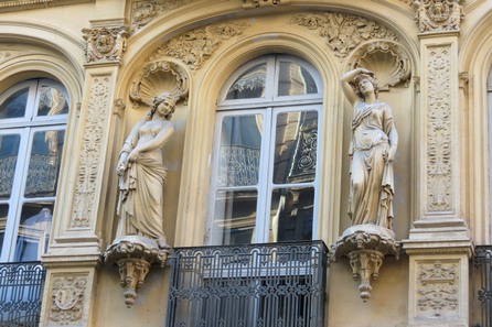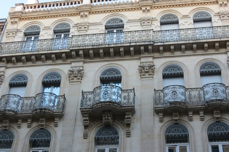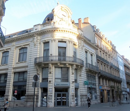 Sur l'une des corniches d'un immeuble style haussmannien de 1895, à l'entrée du bâtiment située à l'angle de la rue Rivals et de la rue Alsace Lorraine (au n°59).