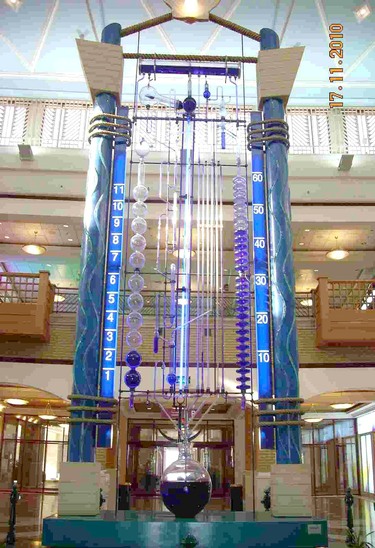 Combinés dans un mécanisme complexe: la clepsydre des grecs qui indique l'heure par l'écoulement de l'eau et le balancier des horloges traditionnelles qui assure la précision.