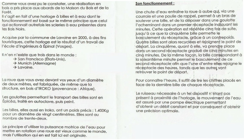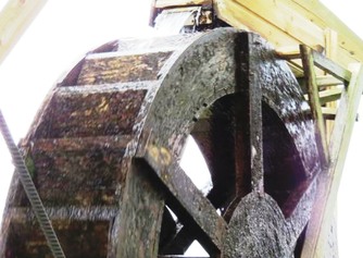 Une pompe électrique assure le débit constant de l’eau. La roue à aube de 2 m de diamètre est en bois d’Iroko, les 32 billes sont en bois d’Assamela. Les goulottes en épicéa.