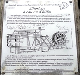 En haut de l’horloge, une chute d’eau permet la rotation d’une roue à aube entraînant un bras qui soulève du sol une bille en bois d’Assamela toutes les minutes