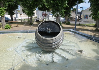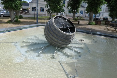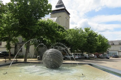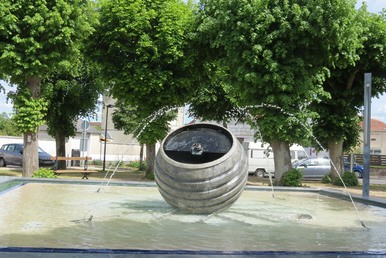 Une grosse sphère de granit (pierre reconstituée) de diamètre 1,40 m affleure la surface d'un plan d'eau carré.