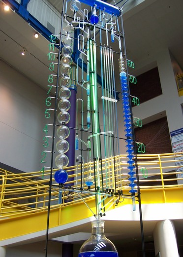 Combinés dans un mécanisme complexe: la clepsydre des grecs qui indique l'heure par l'écoulement de l'eau et le balancier des horloges traditionnelles qui assure la précision.
