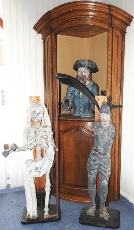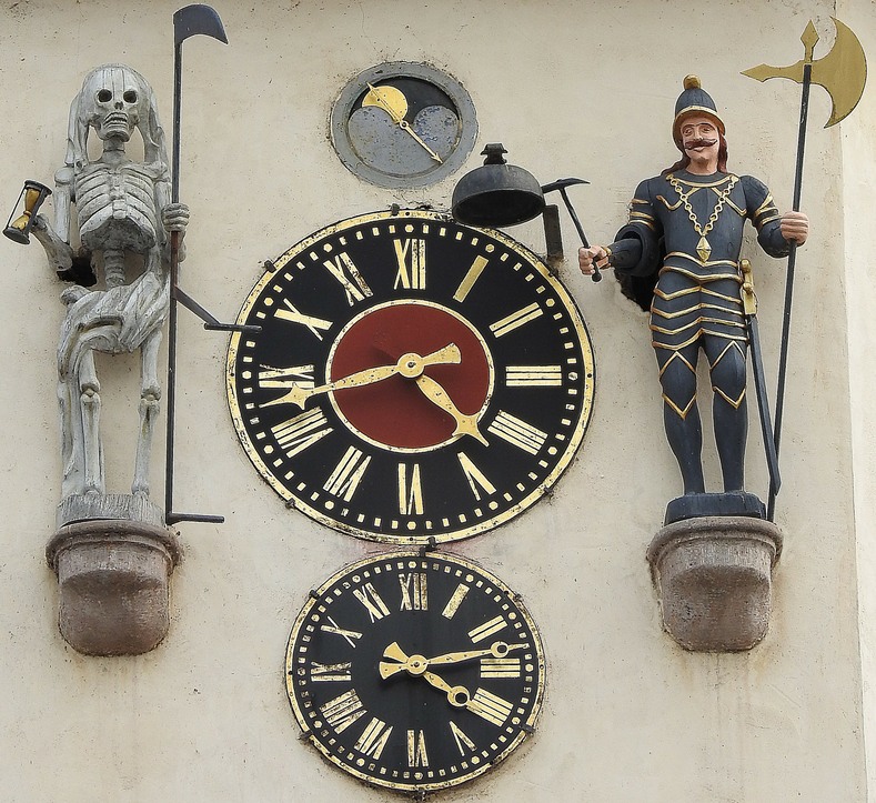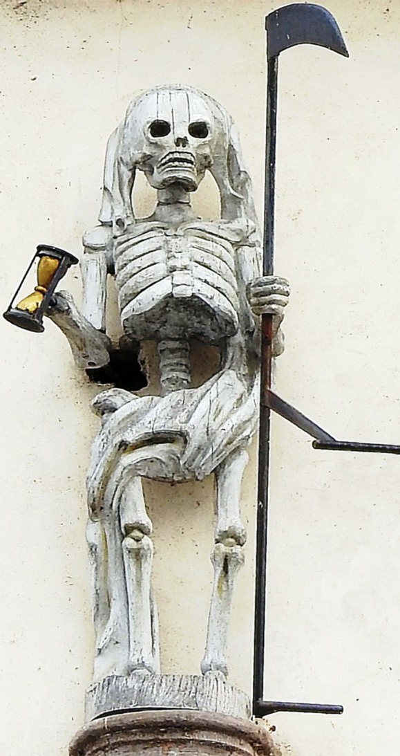 De l’autre côté du cadran se tient un squelette, personnifiant la Mort et tenant une faux de sa main gauche et un sablier de sa main droite, qu’elle tourne toutes les heures.